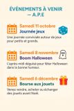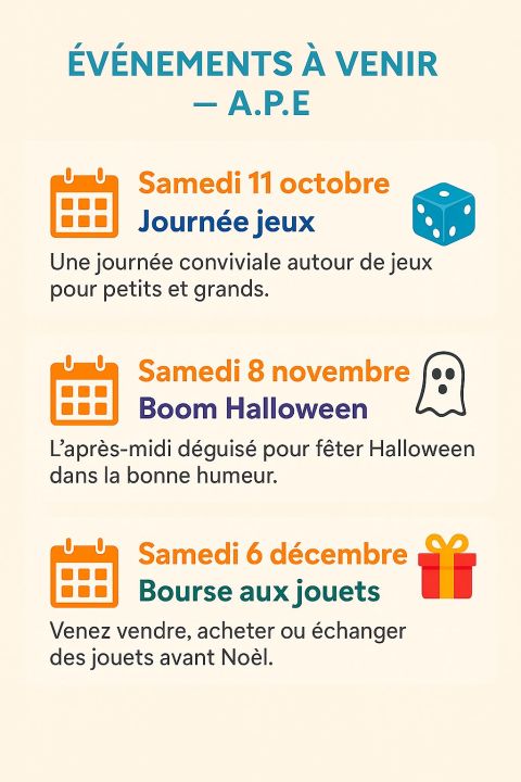 L’association des parents d’élèves a mis en place un calendrier d’événements pour les prochains mois. Vous trouverez ci-dessous les dates importantes à retenir.
